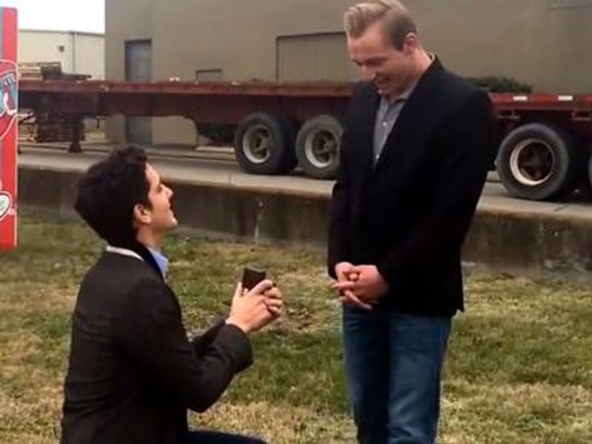 Kelly Clarkson is the latest pop icon to shed light on the fight for marriage equality. The artist's new music video for her heartbreak-turned-hopeful hit, "Heartbeat Song," tells the love stories of couples, straight and gay. The same-sex pair in the video eventually exchanges rings, and sure enough, the couple got engaged in real time during filming. When Chad Laboy proposed to fiance Zac Woodward on set, Woodward was just a bit shocked. His response? "Of course. Duh!"