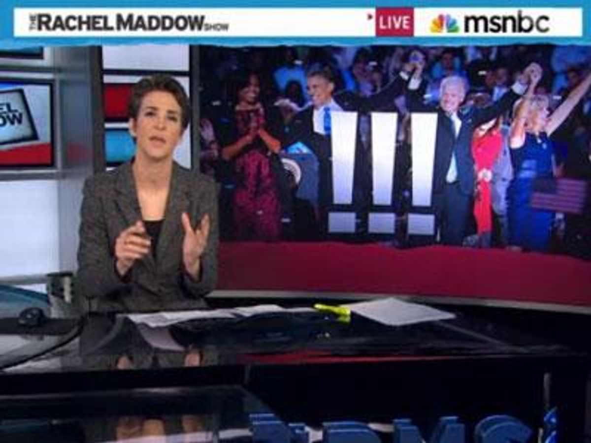 Then she rattled off a list of major wins for liberals, including marriage equality passing not just for the first time but repeatedly. "They voted on marriage equality, and they voted for it," Maddow declared. She also included our first openly gay U.S. senator and the failure of the right-wing to kick a gay-friendly judge from the Iowa bench.