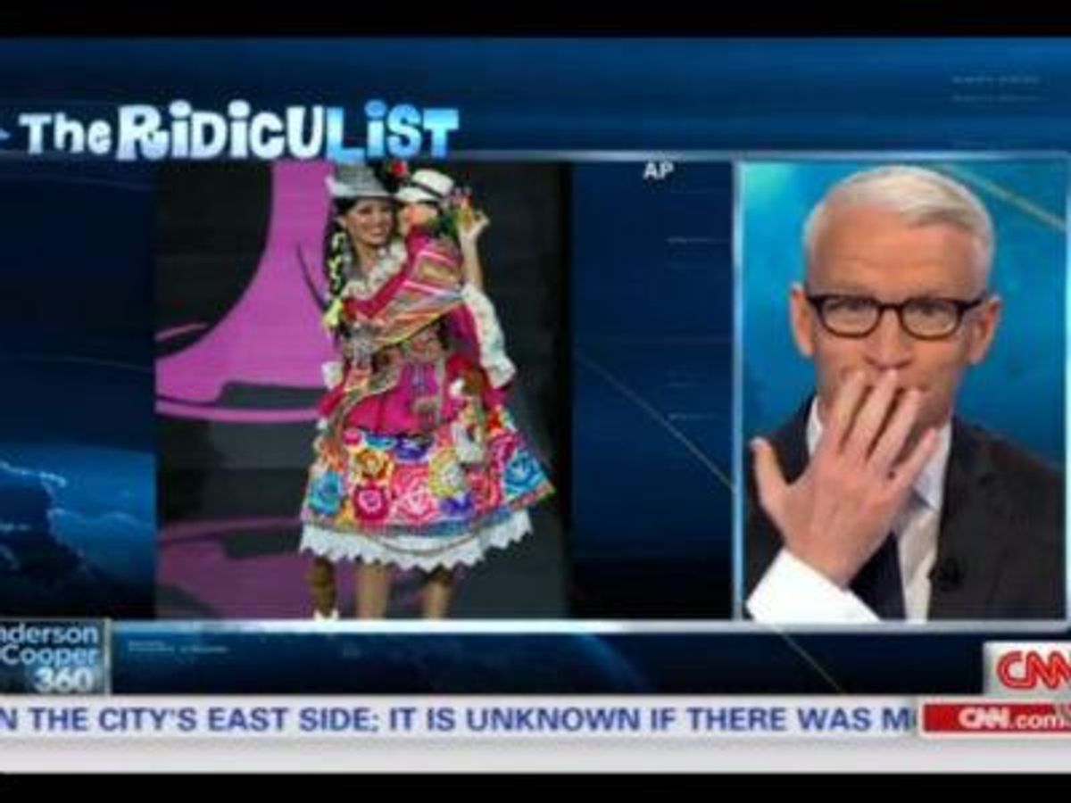 On a recent episode of the out journalist's Anderson Cooper 360 show, his "Ridiculist" segment featured video of Cindy Mejia, Peru's entrant in last weekend's Miss Universe pageant. He dissolved into giggles as he described her costume, a colorful dress representing the traditional attire of women in the nation's Mantaro Valley region, with a plastic baby doll attached to her shoulder.
