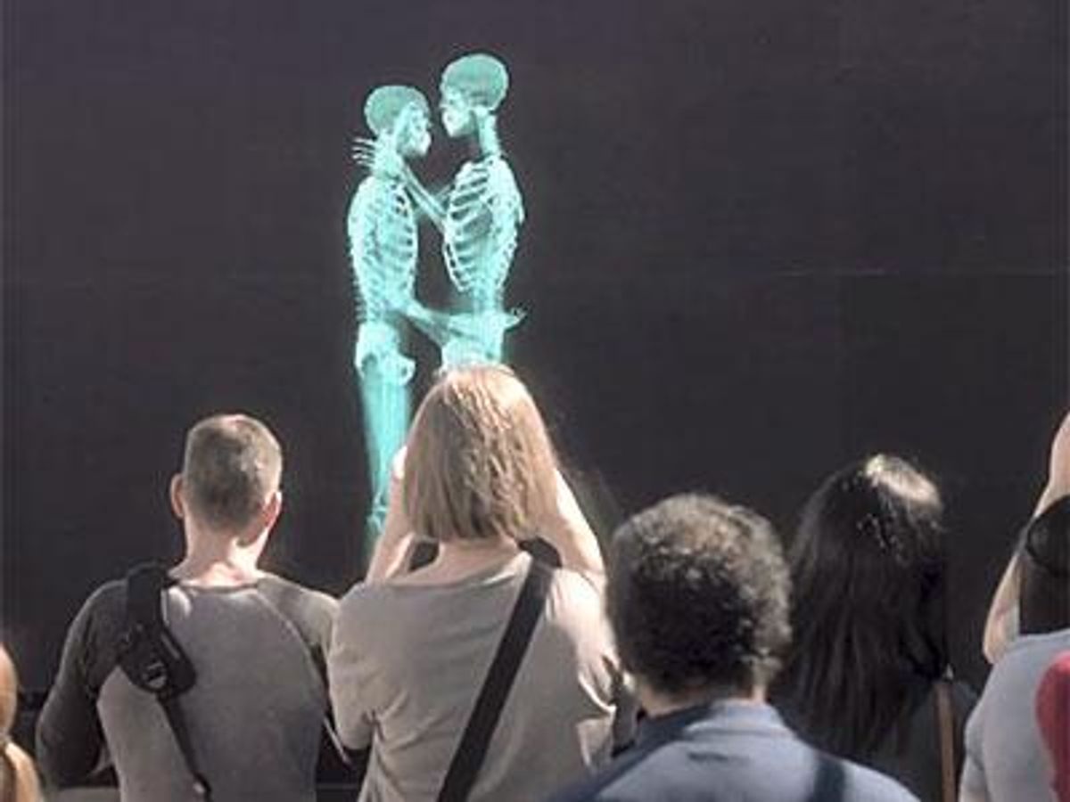 Clocking in at just over three minutes, the heartwarming clip begins with a giant x-ray monitor in the middle of a busy outdoor shopping center in Santa Monica, Calif., showing two skeletons kissing. As a crowd gathers, two women emerge from behind the screen and share a hug and kiss, as the screen displays a message reading "Love has no gender."