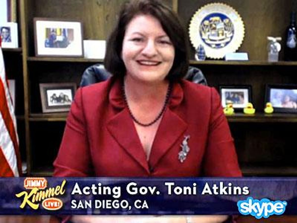 Jimmy Kimmel Skype interviewed Atkins who was in her office in San Diego.