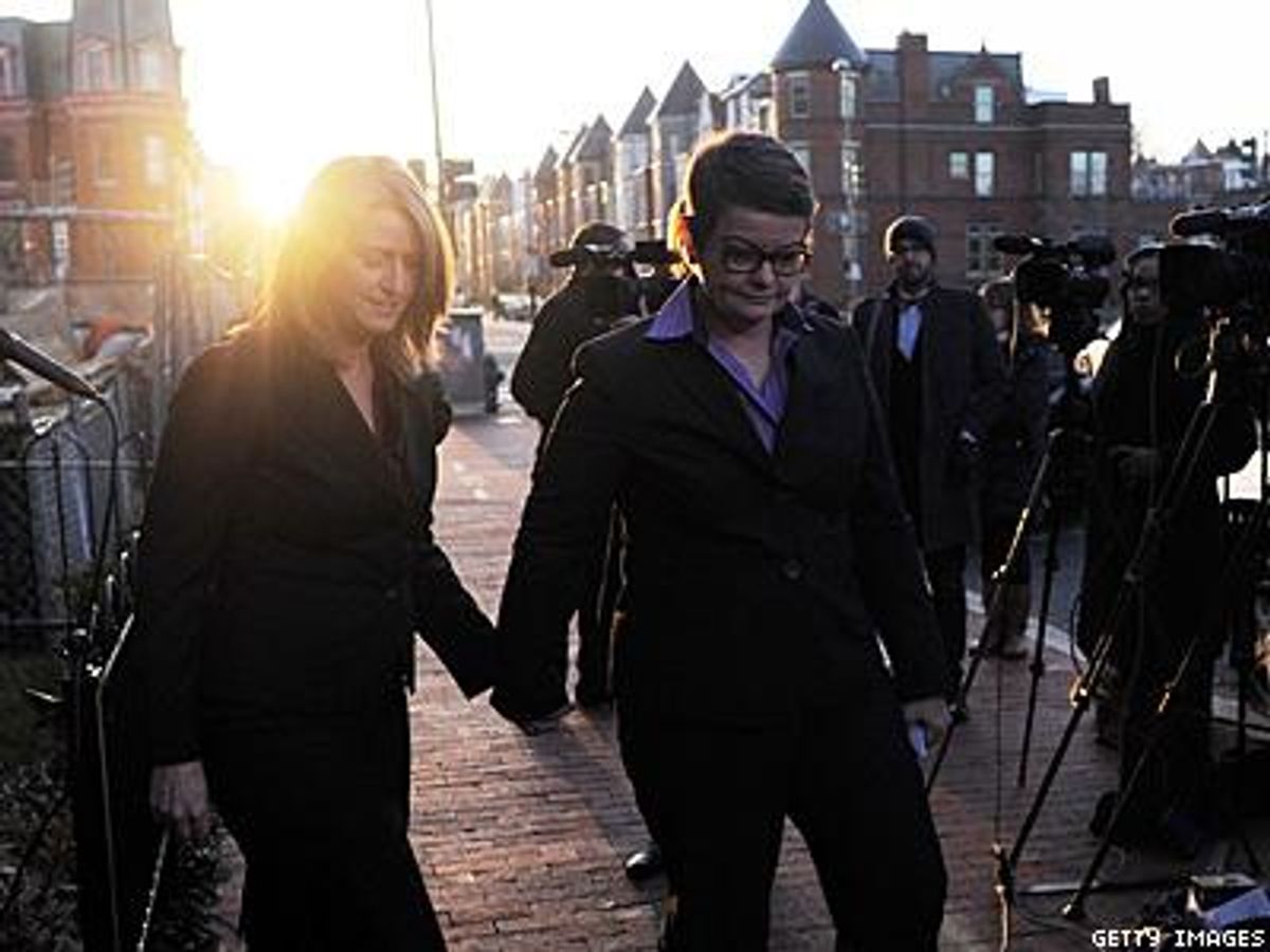Sandy Stier and Kris Perry are the plaintiffs in today's Proposition 8 case and proudly held hands before the cameras while leaving on their way to the Supreme Court today.