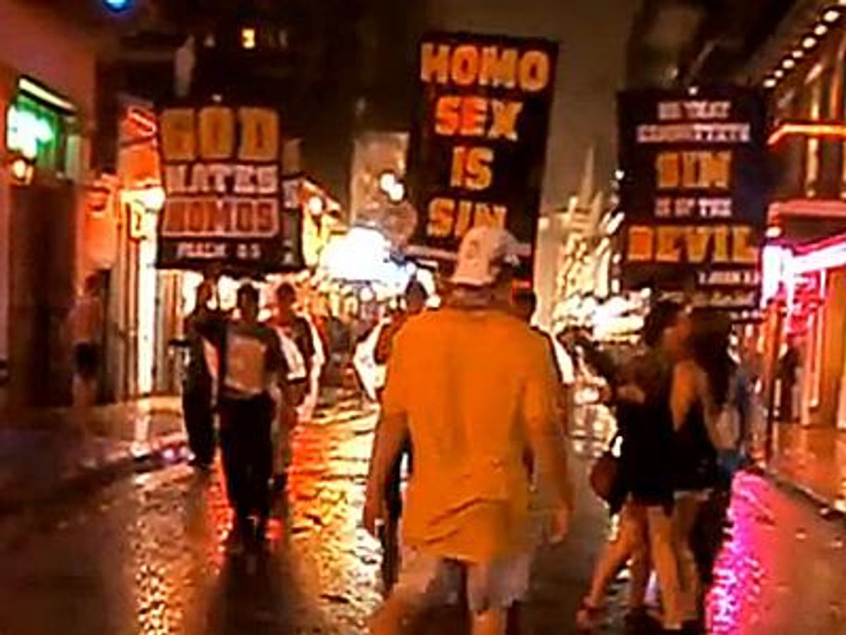 Eight antigay preachers were arrested on suspicion of violating the law during this year's Southern Decadence, an LGBT-focused annual celebration in the city's French Quarter, which includes Bourbon Street. A ninth was arrested on suspicion of battery and resisting a police officer who attempted to take away his bullhorn. Some preachers present that night carried signs with slogans such as "God Hates Homos" and, according to witnesses, shouted homophobic slurs.