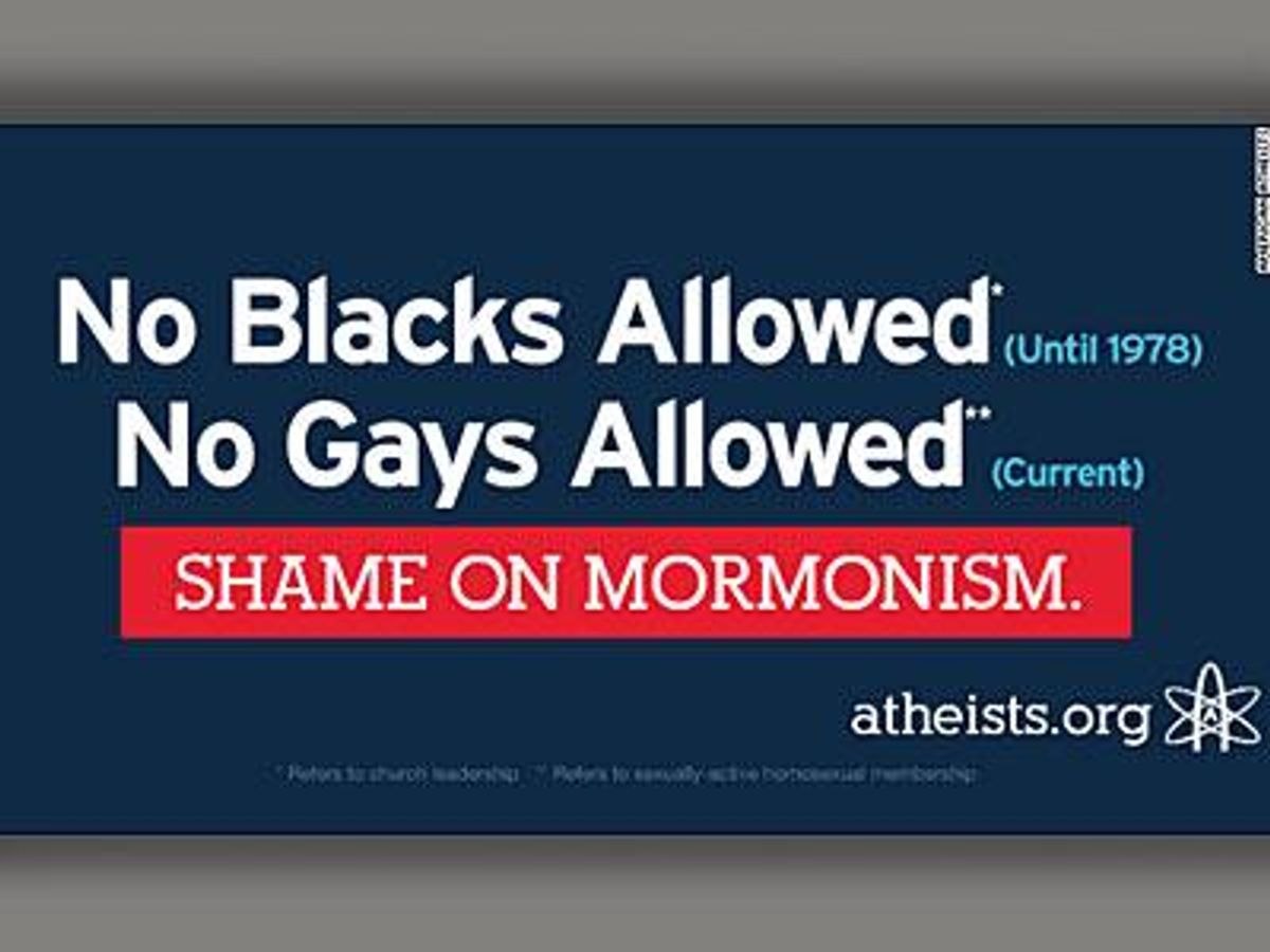 The billboard, traveling around southern Florida, reads, "No Blacks Allowed (Until 1978). "No Gays Allowed (Current). Shame on Mormonism." It is sponsored by American Atheists.