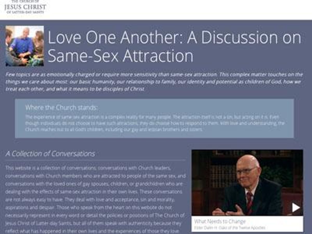 The site, MormonsAndGays.org, has a home page headline reading "Love One Another: A Discussion on Same-Sex Attraction." It reiterates the church's position that "the attraction itself is not a sin, but acting on it is." It offers a series of videos by LGBT Mormons, their family members, and church leaders and encourages recognition of everyone's common humanity.