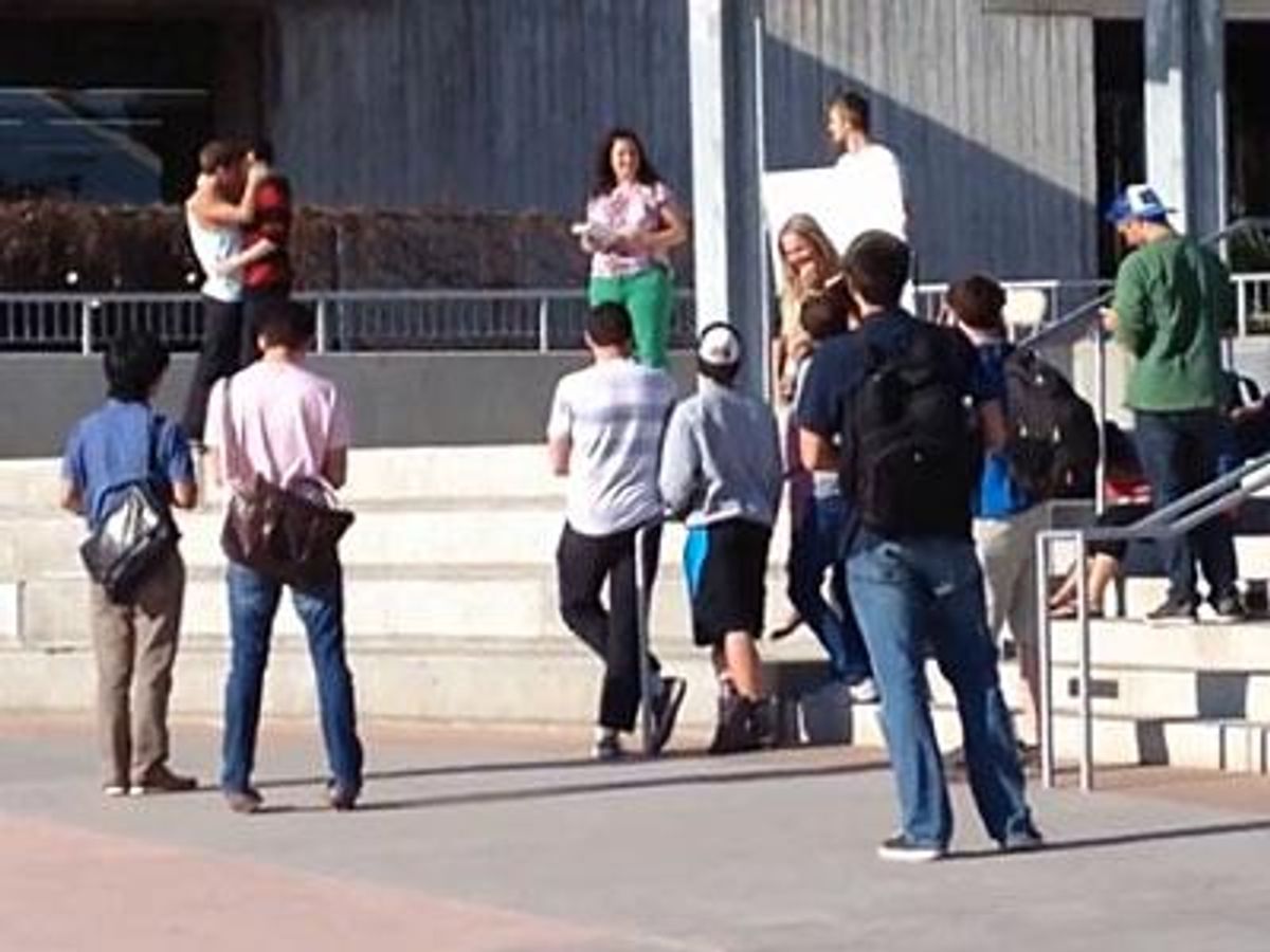 The "gay makeout session," which was captured on video and posted on YouTube Tuesday received cheers and applause from the crowd gathered around the outdoor steps on the San Luis Obispo campus. The reaction drowned out the words of the woman delivering the sermon, who was rendered momentarily speechless when the couple raced up next to her and embraced.