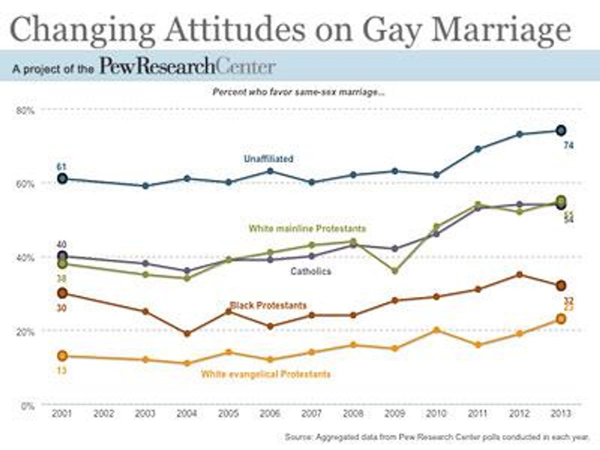 Only 13% of white evangelicals supported marriage equality in 2001. While only 23% support marriage rights for same-sex couples 12 years later, the increase has come mainly in the last four years. Figures among black Protestants has remained essentially the same, with 30% supporting marriage in 2001, a steep drop in 2004, and then 32% supporting marriage equality now.