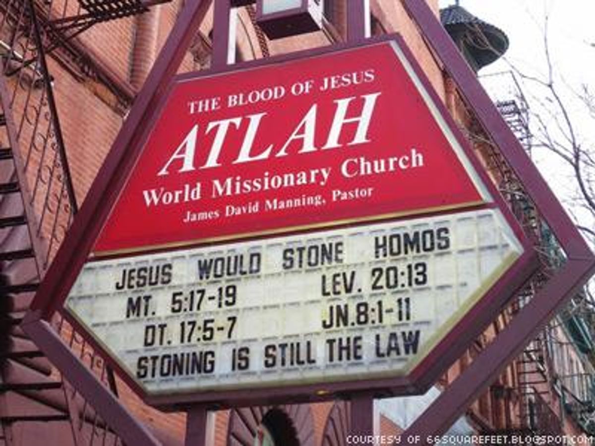A New York-area woman has called the bluff of a Harlem church that has displayed signage with antigay messages claiming "Jesus Would Stone Homos."