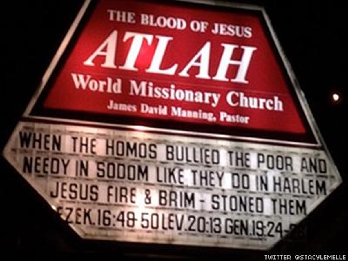 The ATLAH World Missionary Church in New York City's Harlem neighborhood, notorious for homophobic messages on its signage and from Pastor James David Manning's pulpit, has a new and unbiblical hate statement on its marquee.