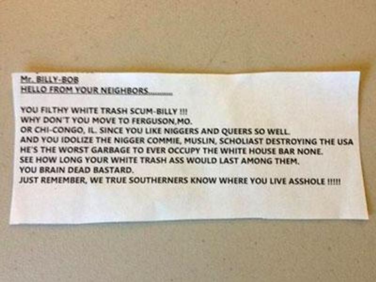 The angry response came in the form of a typed, typo-ridden note that ranted against Communists, Muslims, and Socialists, and suggested that the recipient "move to Ferguson, Mo. ... since you like [n word]s and queers so well." It concluded with "We true Southerners know where you live asshole!!!!!"