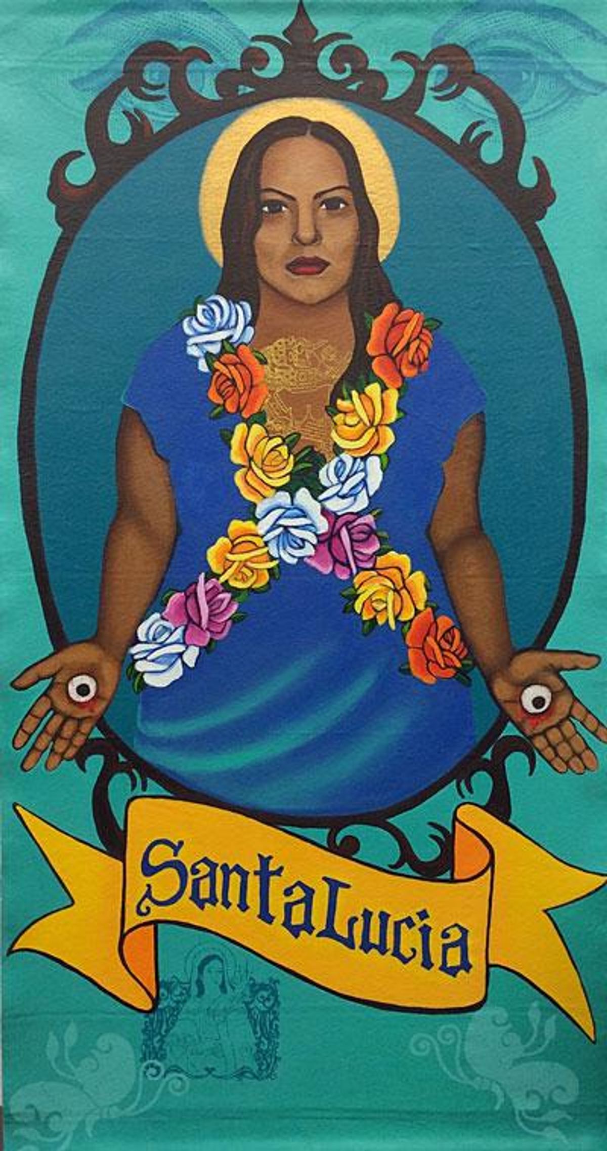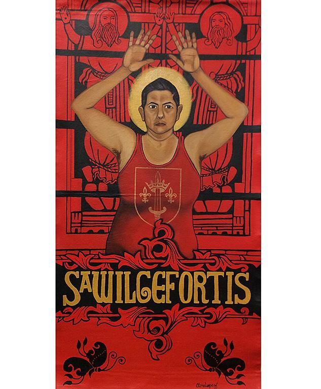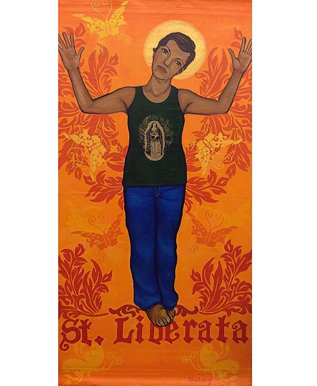 The "Queer Saints" exhibition, which is being shown at the Pacific School of Religion in Berkeley, Calif., through January 9, includes paintings and silkscreen prints that bring the artist's lesbian perspective to the saints she learned about as children. (Lopez's website says that "most of [her] visual work raises questions about popular Mexican icons filtered through a radical Chicana feminist lesbian lens.")
