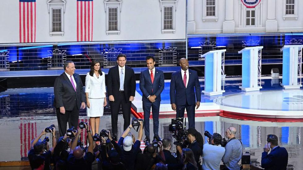 Pictured, from left: Candidates Chris Christie, Nikki Haley, Ron DeSantis, Vivek Ramaswamy, and Tim Scott