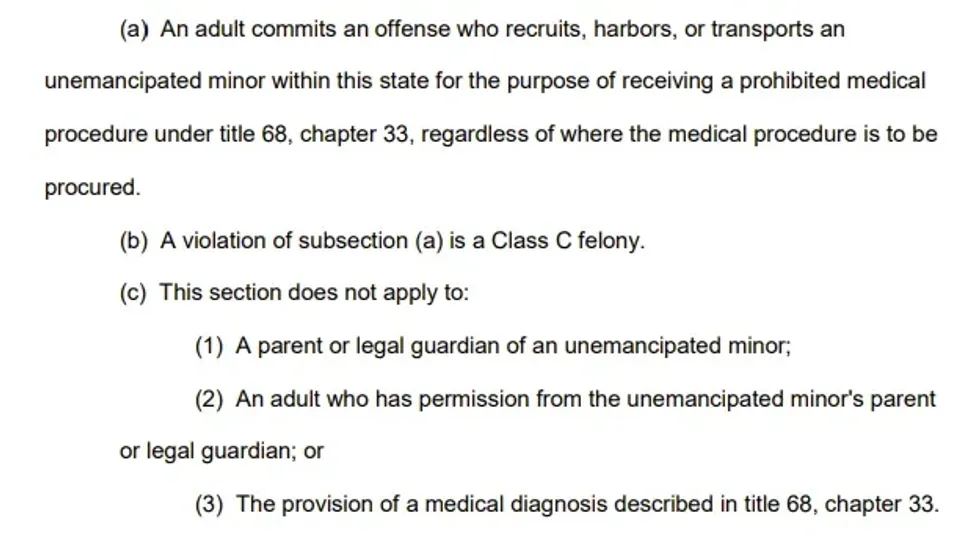 The bill is Senate Bill 2782. The language of the bill was amended before its passage Thursday, stating that any adult who "recruits, harbors, or transports" a minor in Tennessee for the purpose of gender-affirming care could be guilty of a Class C felony, which carries a prison sentence of three to 15 years. Read broadly, it could prohibit discussing healthcare options available in other states with transgender youths or providing maps of "safe states" for transgender healthcare to a transgender youth, though some legal experts say that this reading is constitutionally dubious and could violate first amendment protections.