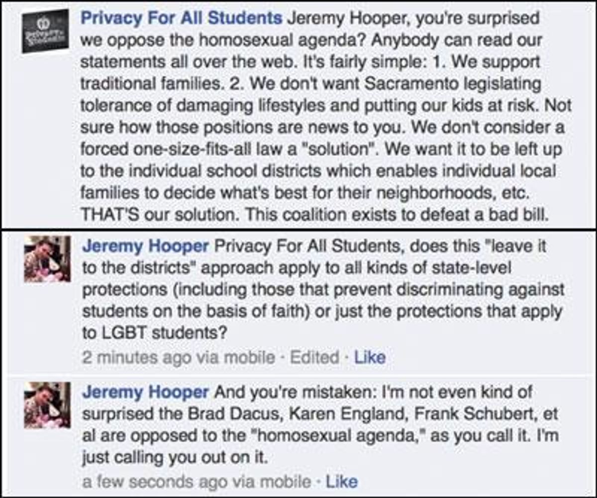 "Jeremy Hooper, you're surprised we oppose the homosexual agenda?" asks the post, mistakenly conflating a transgender identity with a gay sexual orientation. "Anybody can read our statements all over the web. It's fairly simple: 1. We support traditional families. 2. We don't want Sacramento legislating tolerance of damaging lifestyles and putting our kids at risk."