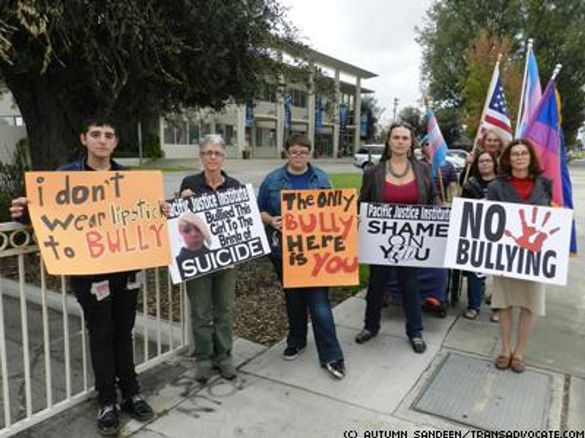 "Our action at PJI's SoCal office was two-fold," explains Williams in the blog post at TransAdvocate. "1.) Tell them that we want them to stop bullying and harassing Jane Doe, the transgender youth who attends Florence High School in Florence, Colorado, because their bulling and harassing brought her to the brink of suicide, and 2.) ask them to have Michael Peffer (or any other representative at PJI) come out and tell the two trans youth in the group of ten community participants that they are bullies, and that they are "inherently harassing" to other teens in restrooms they use at their public high school."