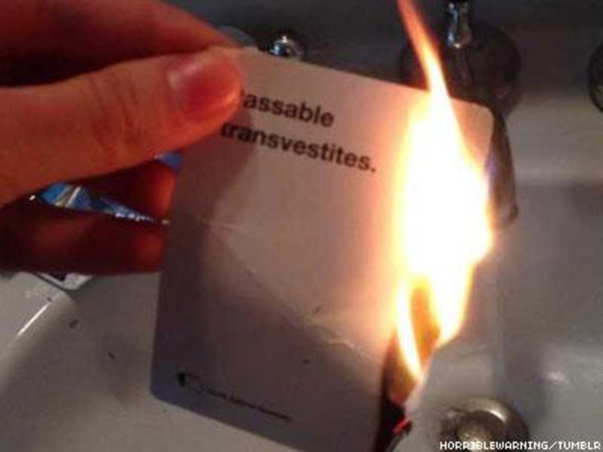Jonah, who identifies as transgender, discovered while playing one evening that one of the white answer cards read, "passable transvestites." Hitting too close to home, Jonah lit the card on fire, posting a photo to his Tumblr and Instagram accounts with the caption "DEATH TO TRANSPHOBIA."