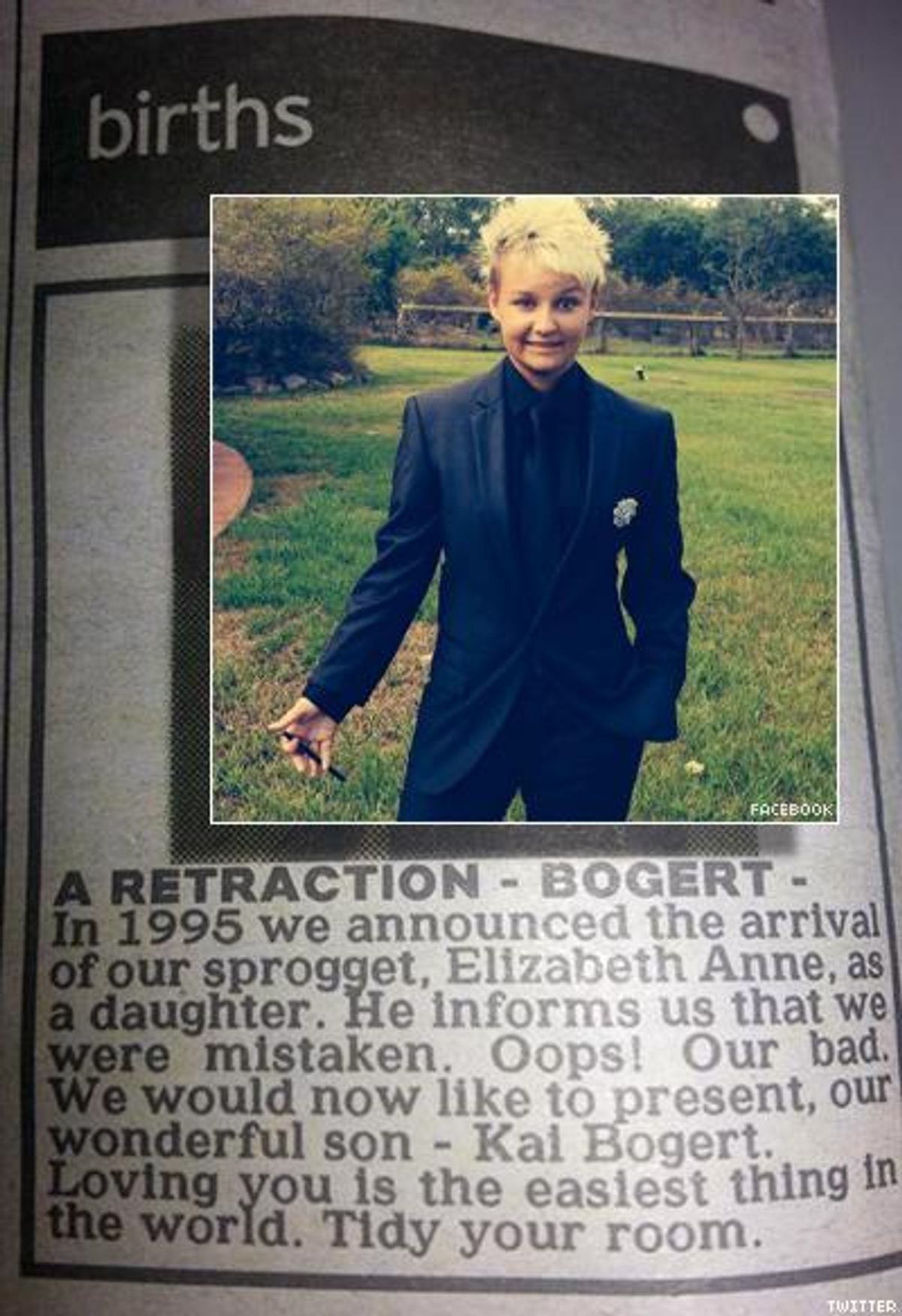 "In 1995 we announced the arrival of our sprogget Elizabeth Anne as a daughter," reads the announcement from Yolanda Bogert in The Courier-Mail of Brisbane. "Oops our bad. We would like to present our wonderful son -- Kai Bogert. Loving you is the easiest thing in the world. Tidy your room."