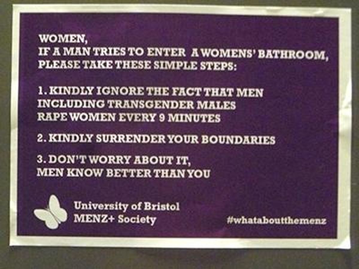Posted outside women's restrooms in the Wills Memorial Building, the parody signs claim to be from the "MENZ+ Society," a group that does not exist at Bristol, according to the Epigram. The sign misgenders trans women, stating, "Women, if a man tries to enter a women's bathroom, please take these simple steps: 1. Kindly ignore the fact that men including transgender males rape women every 9 minutes 2. Kindly surrender your boundaries 3. Don't worry about it, men know better than you."
