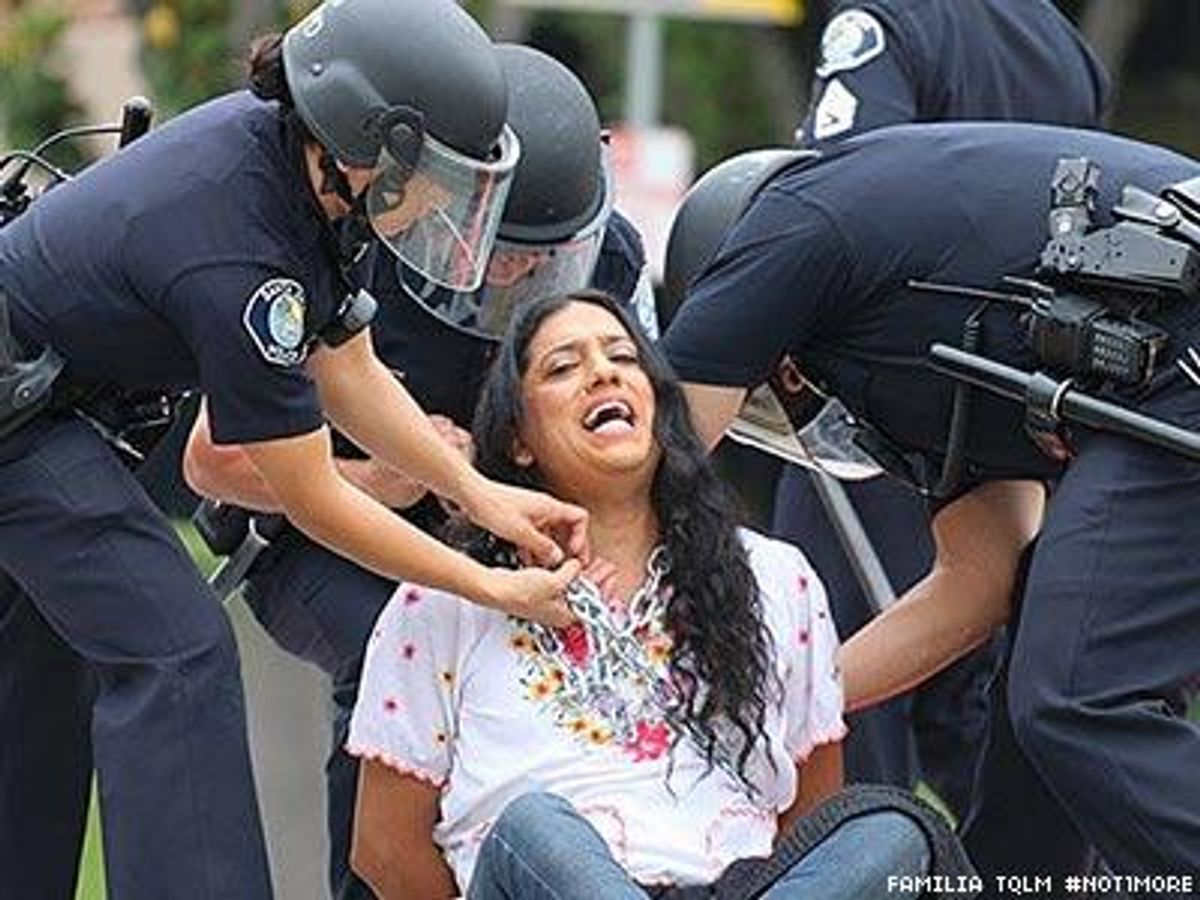 Chains represent the deplorable conditions transgender detainees in Immigration and Customs Enforcement custody face every day, activists explained. Above, activist Isa Noyola is arrested by Santa Ana police officers. Also arrested were Mar Martinez, Paolo Palomar, Jiselle Oneel, and Jorge Hernandez.