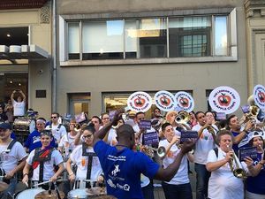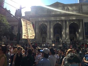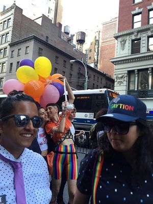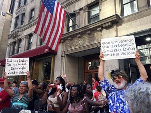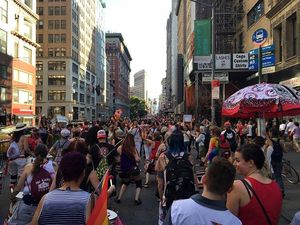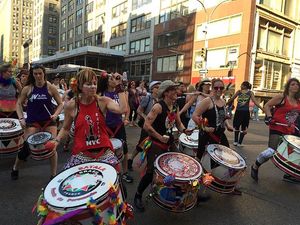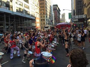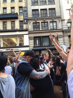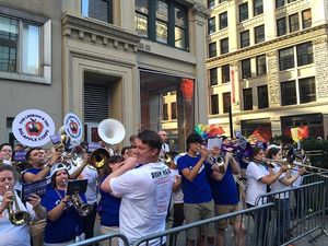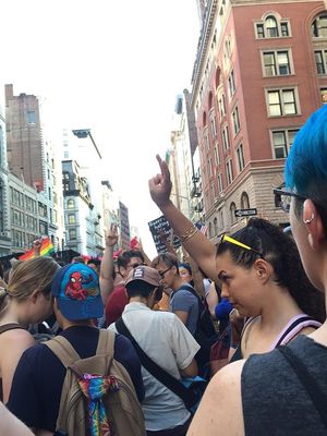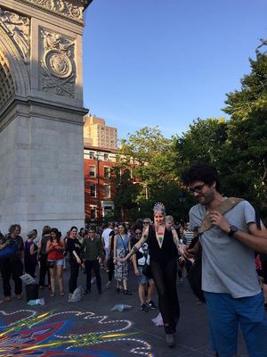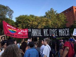 Thousands gathered for the march, which began at 42nd Street and Fifth Avenue on Sunday at 5 p.m ended several hours later at Washington Square Park, the destination of the nation's first LGBT protest march. During the march, a moment of silence for the 49 victims of the Pulse nightclub shooting in Orlando brought many protesters to tears, but the spirit of resistance returned as supporters in drag loudly sang "God is a Lesbian" from the sidelines, complete with lyrics on large posters. The Lesbian and Gay Big Apple Corps marching band played pop hits including Katy Perry's song "Firework," bringing infectious joy to marchers who stopped in the street for the impromptu sideline concert.