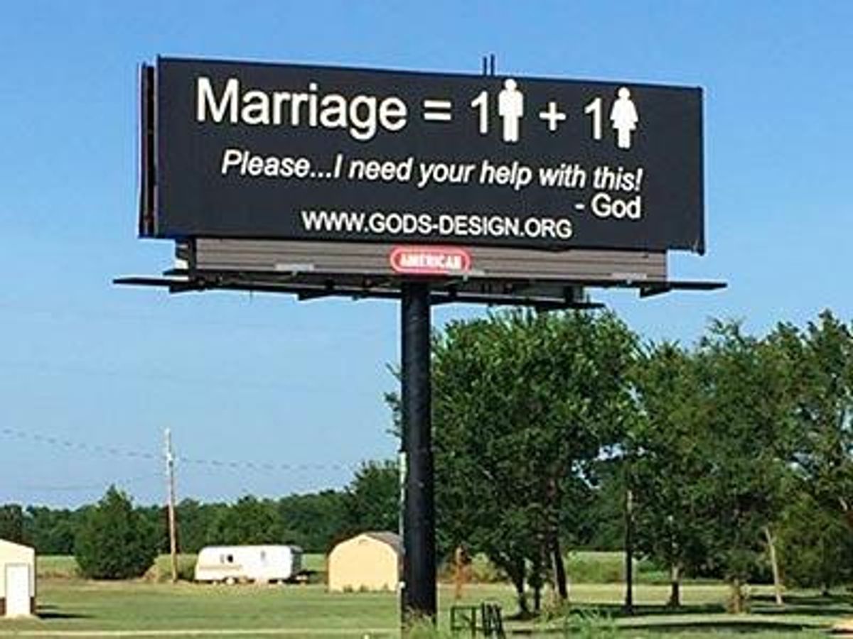 The first billboard, which is 14 feet by 48 feet, went up recently in Durant, Okla. It quotes God as saying marriage is between one man and one woman.
