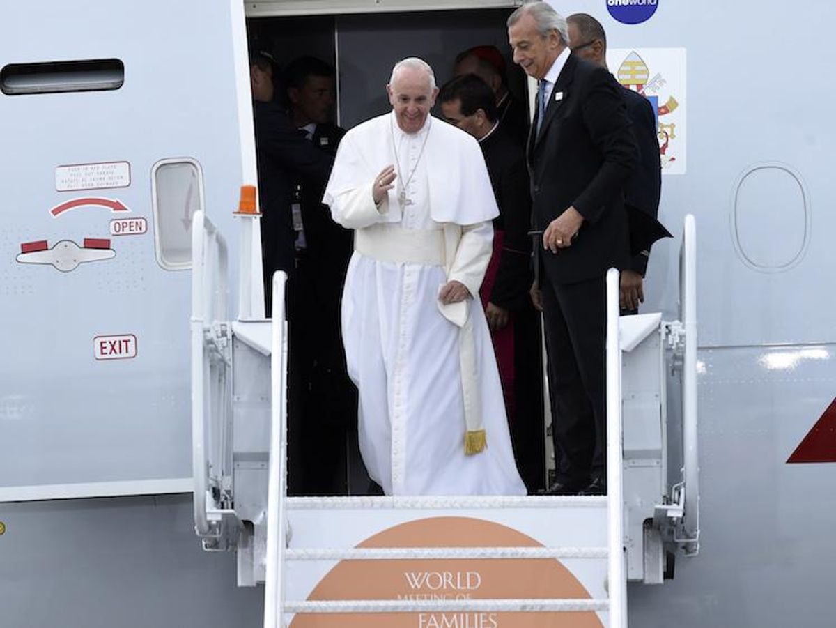 The plane was greeted with a staircase emblazoned with the logo of the World Meetings of Families, which is the reason for his visit to the U.S.