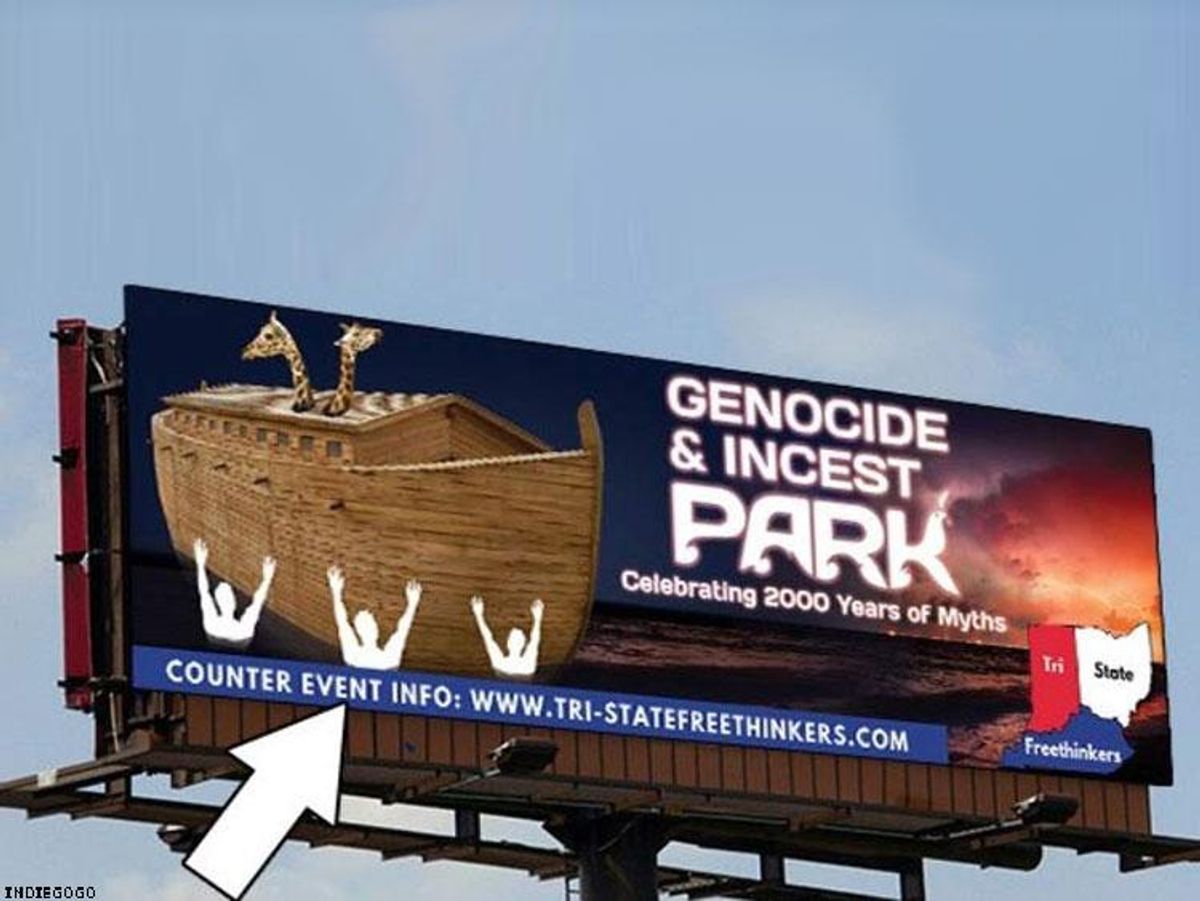 An atheist group is mocking the planned construction of a Noah's Ark theme park in Kentucky with a billboard campaign that refers to the project as a "genocide and incest park." The billboards additionally claim that the park "[celebrates] 2000 years of myths," reports the Louisville Courier-Journal.