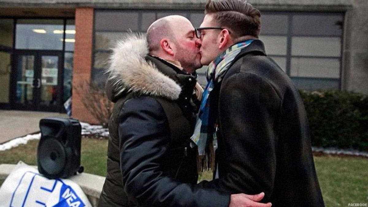 About 100 people showed up to support him Monday night, and he and his husband, Philip, received a standing ovation at the school board meeting, Chicago TV station WMAQ reports. Several made statements to the media. "For this to happen now in this day and age, in [the] 21st century, this has to go," retired teacher Deb Twenhafal told WMAQ.
