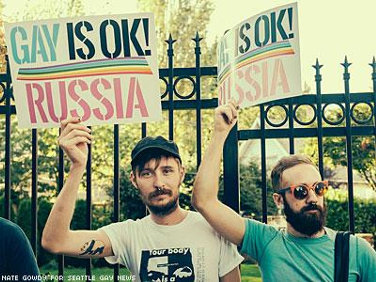 Hundreds of people gathered outside the Seattle Russian Consular Residence Tuesday for a peaceful demonstration supporting LGBT human rights in Russia and demanding the repeal of the country's antigay laws. The demonstration, which was co-organized by Dan Savage and Seattle mayor Mike McGinn, was timed to take place one day before Western leaders met with President Vladimir Putin at the G20 Summit in St. Petersburg, Russia. The rally was one of many Global Speak Out events being held worldwide that day and was endorsed by several LGBT organization,s including All Out, GLAAD, and the Human Rights Campaign. Take a look at photos from the event on the following pages.
