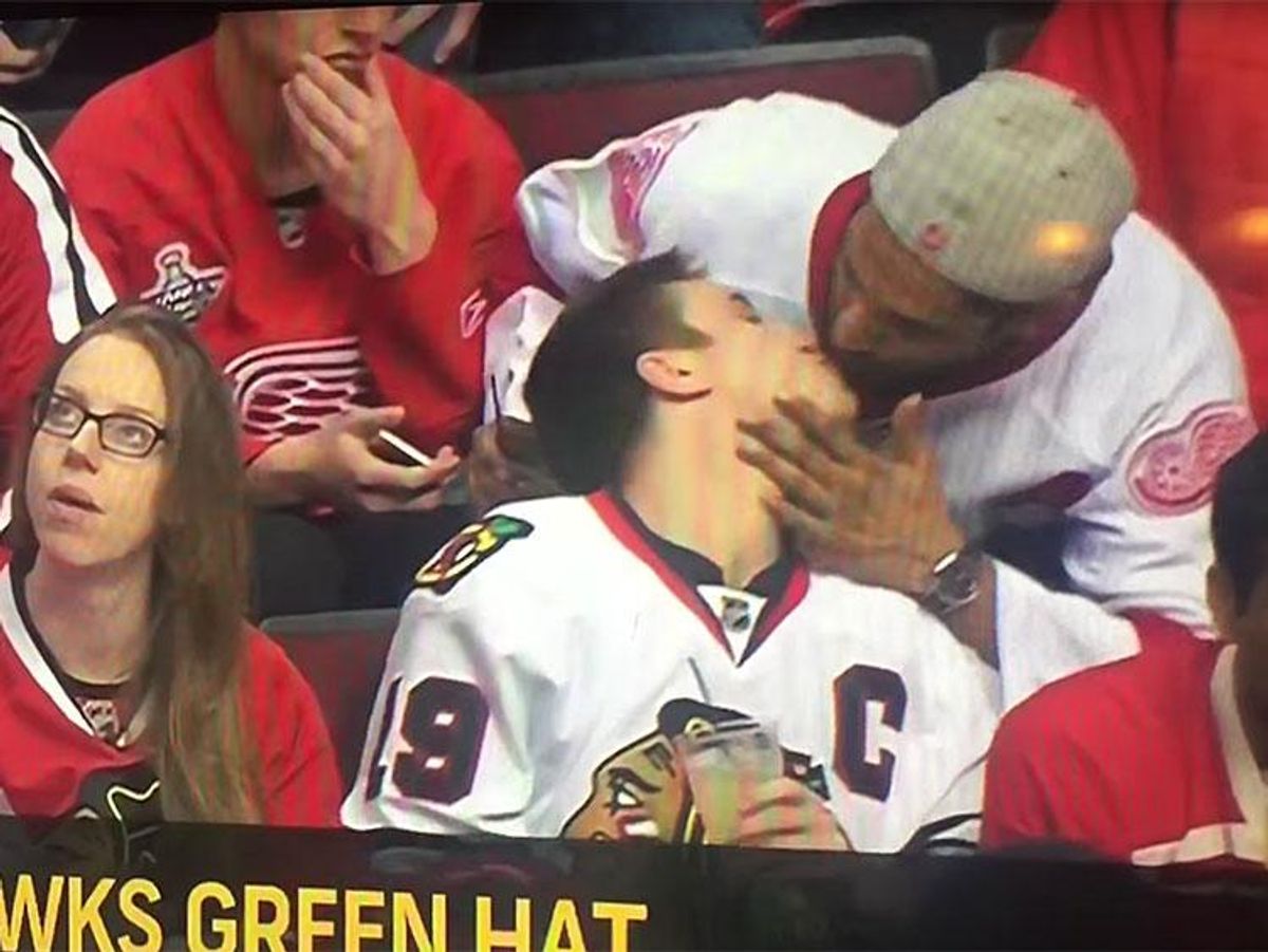 A Detroit Red Wings fan kissed another man wearing a Chicago Blackhawks jersey Sunday at a National Hockey League match.