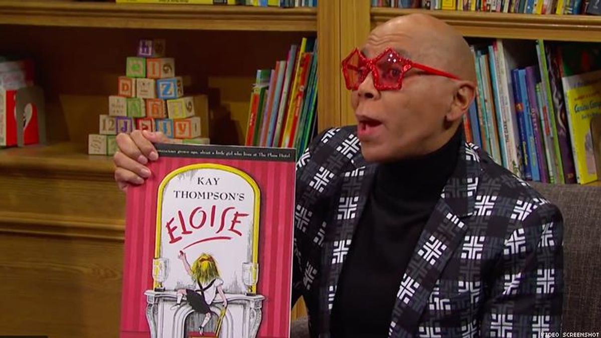 Holding up the book Eloise, RuPaul said, "Ooh, Eloise, you need to call the front desk and get a hot oil treatment for that broom on your head. And Victoria's Secret called. They want their wallpaper back."