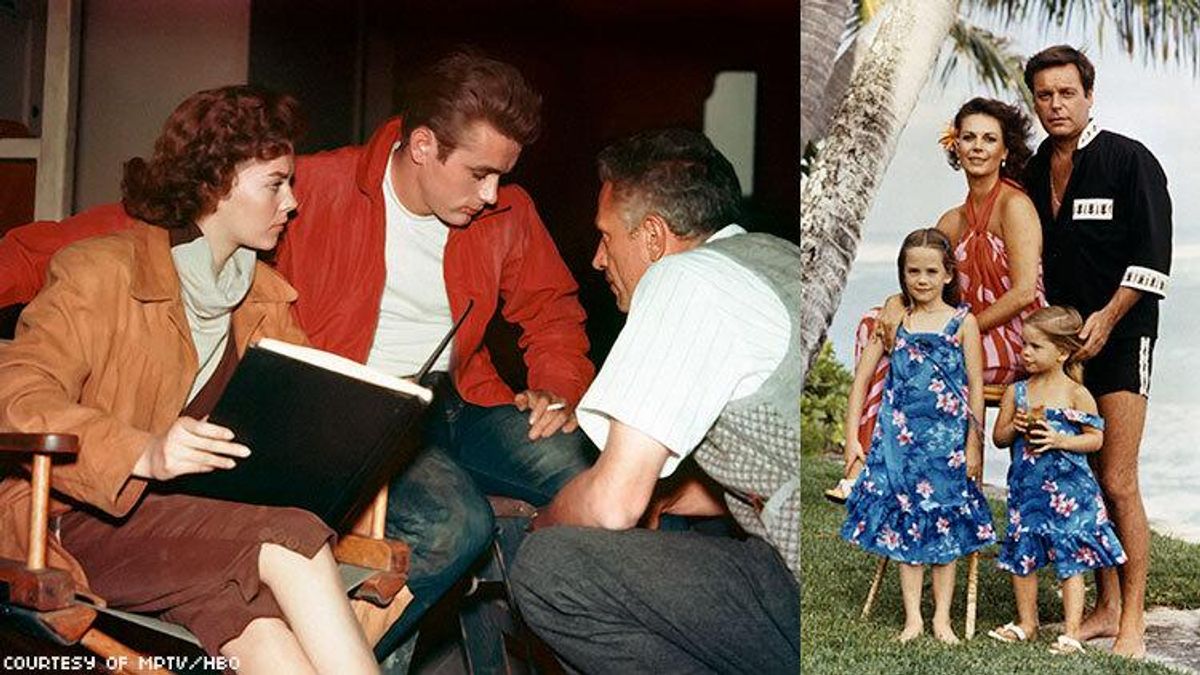 Pictured: Natalie Wood with costar James Dean and director Nicholas Ray on the set of Rebel Without a Cause, for which Wood received her first Oscar nomination; Wood with husband Robert Wagner and daughters Natasha (left) and Courtney.