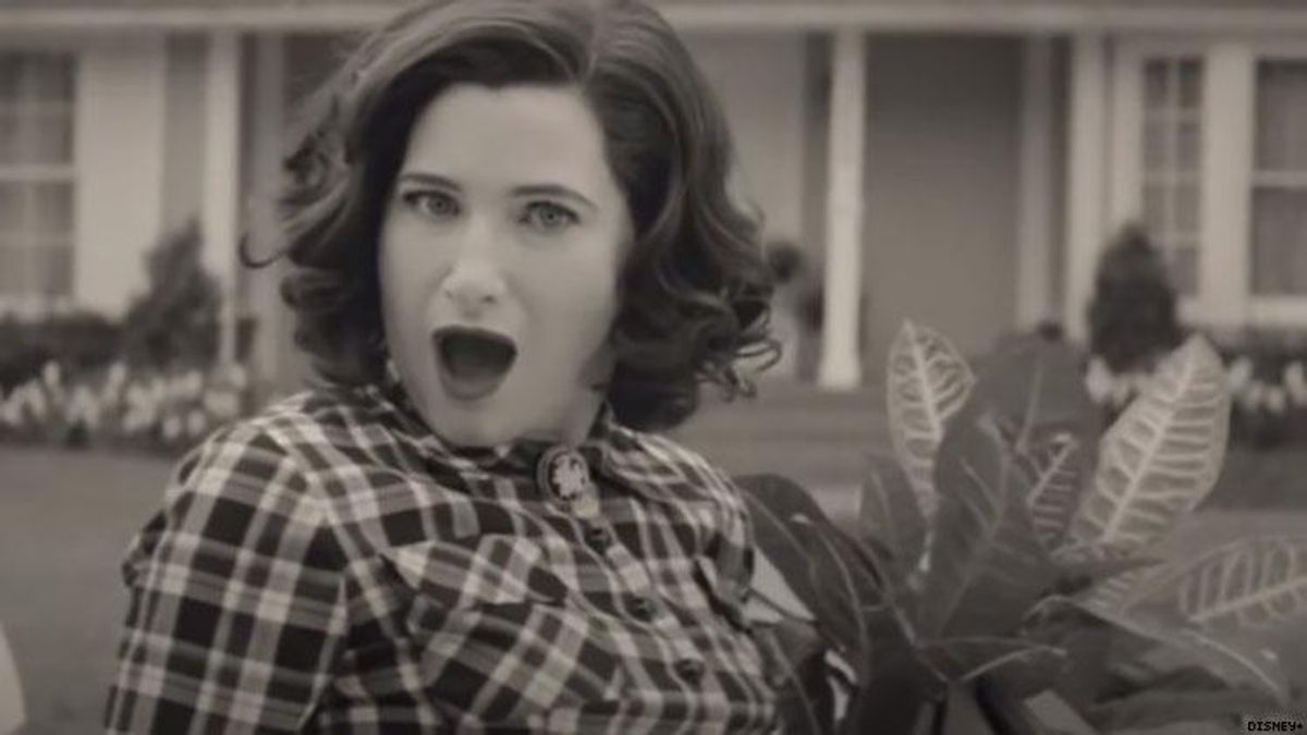 The incredible performance of Kathryn Hahn -- a gay icon in her own right from roles in Bad Moms and Transparent -- fleshes out this sensibility. Her face is a master class in emotional shifts, knowing nods, and sly winks to the audience watching the events transpiring in WandaVision. Her words also provide meta-commentary to the plot's ridiculousness. "Your accent comes and goes, doesn't it?" she tells Wanda, who is from a fictional Eastern European country. "Who are you? All those costumes and hairstyles!" She even references The Wizard of Oz, informing a temporarily disempowered Wanda, "You're magic's no good here."