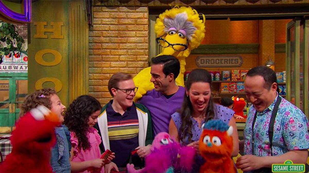 The episode focused on Big Bird, who's wishing his grandmother could attend the Family Day party, only to be surprised when it turns out she was there all along. It's pretty adorable. But what made this episode stand out is that some new human characters were also in on the surprise: Dave (Chris Costa, as the brother of Nina, the street's bike store owner), his husband, Frank (Alex Weisman), and their daughter, Mia (Olivia Perez).