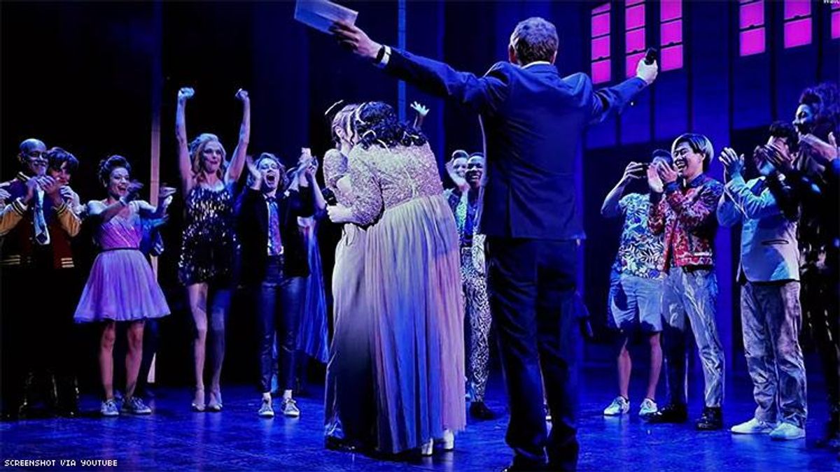 After a performance of the show at Broadway's Longacre Theatre on Saturday, Armelle Kay Harper, a script coordinator on the show, and Jody Kay Smith (an actor and singer who recently worked with The Prom's musical director) said their "I dos." The ceremony, for which audience members were invited to stay to witness and become a part of history, was officiated by The Prom's co-book writer Bob Martin.