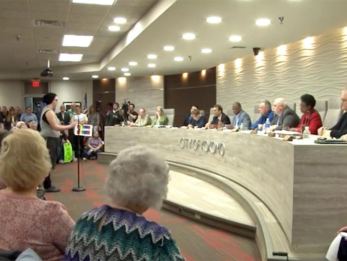 Despite the fact that a majority of residents in the standing-room-only crowd rose in opposition to the ordinance, council members nonetheless voted 5-4 to approve the LGBT protections on first reading, according to the Kokomo Tribune. Voting in favor of the amendment were council president Bob Hayes, vice president Mike Kennedy, Steve Whikehart, Donnie Haworth, and Janie Young, according to the Tribune. Democrats Mike Wyant and Bob Cameron joined two Republican colleagues, Cindy Sanders and Tom Miklik, in opposing the ordinance.