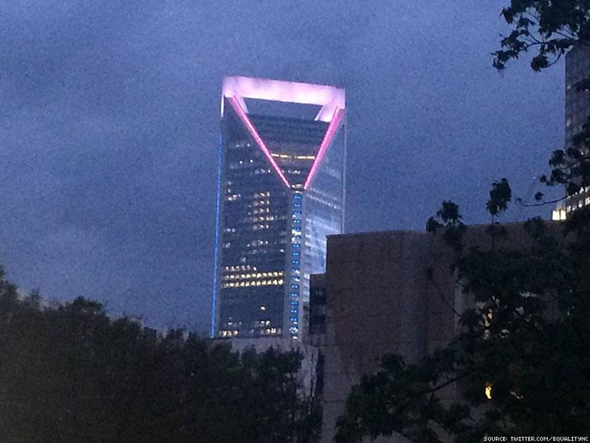 The bank lit the highrise in honor of International Transgender Day of Visibility, only a week after the governor of North Carolina signed House Bill 2, a law barring transgender people from accessing public facilities like bathrooms and locker rooms that correspond with their gender identity, and eliminating all LGBT-inclusive nondiscrimination ordinances in the state.