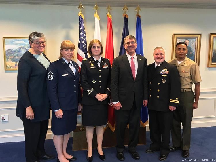 Above: LGBT military group SPARTA president Sue Fulton (far left) stands with transgender service members and Defense secretary Ash Carter (center in red tie) during one of the secretary's meetings with trans troops.