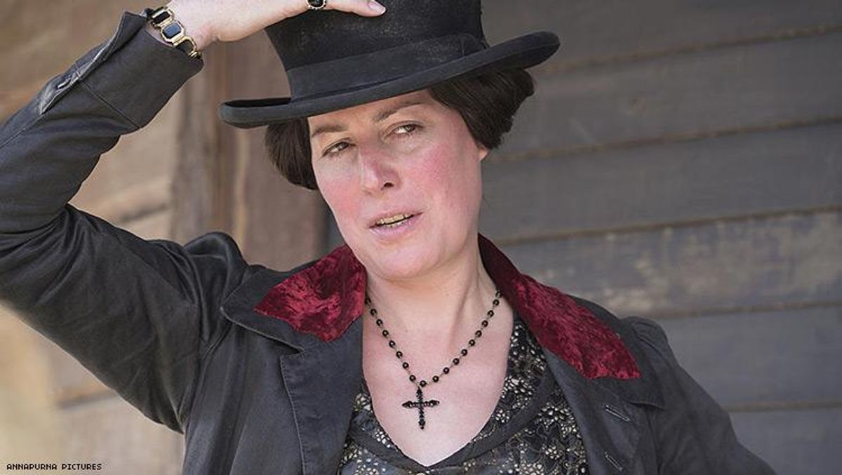 In the 2011 novel for The Sisters Brothers by Patrick DeWitt, Mayfield is a man. Not so in the film version -- the part is female, and Root portrays her as a cisgender women. This rewriting is alluded to when the character Charlie (Joaquin Phoenix) expresses surprise at seeing a woman in Mayfield's boots.