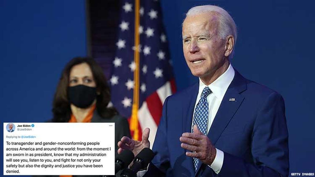 Biden also spoke directly to this at-risk community. "To transgender and gender-nonconforming people across America and around the world: from the moment I am sworn in as president, know that my administration will see you, listen to you, and fight for not only your safety but also the dignity and justice you have been denied."