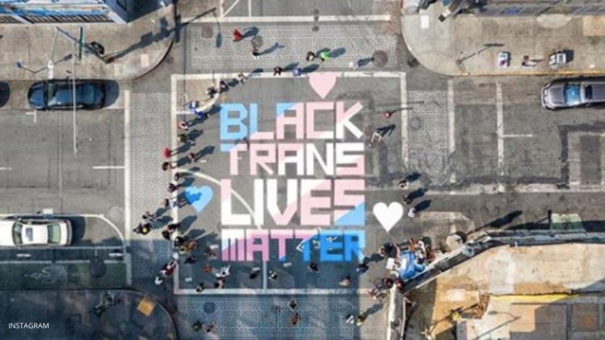 The mural reads "BLACK TRANS LIVES MATTER" and is painted in the colors of the trans flag to commemorate the 54th anniversary of the Compton's Cafeteria Riot, which is viewed as one of the first LGBTQ+ uprisings -- three years before Stonewall.