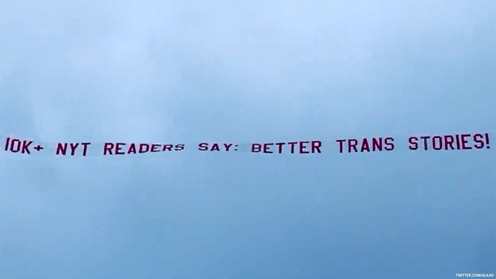 To highlight that fact, the coalition flew an airplane across New York City at 9 a.m. with a banner stating “10k NYT readers say: better trans stories!”