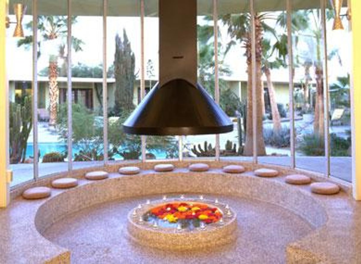 A fully restored and modernized motel, Hope Springs is situated at the edge of Desert Hot Springs, a rundown town that is itself nothing to look at. But the fresh feel of Hope Springs is worth a venture off the beaten path. The mid-century modern experience begins on arrival as you set your sights on a tiled pool full of floating flowers and surrounded by pillows. You will be personally greeted by the woman who runs the place and escorted to one of the 10 guest room on the property. The rooms are purposefully Spartan and feature a deconstructed wall-free closet jutting diagonally into the center of the room, a Japanese-style platform bed, balloon-shaped hanging paper lamps, and a sitting chair. The floors are polished concrete, which continues out to the private balcony outside each room. Windows are left open to allow the swamp coolers to keep the room temperate -- privacy is gained by pulling back an enormous white sheet strung from a wire across the middle of the room. No TVs here; entertainment is a good book read beside one of the three natural hot spring pools in the courtyard outside your room -- the hottest of which is housed in a tin-covered gazebo -- or on the grass patio that looks south over the town and desert below. Some rooms feature a kitchen space complete with authentic mid-century dishware and a small fridge, though the adorable classic stoves are nonfunctional.