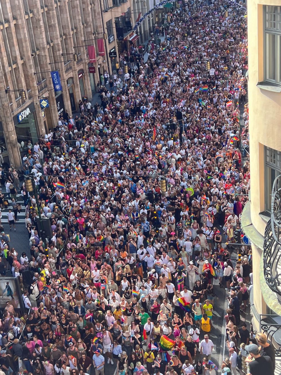From a bird’s-eye view at Hotel Kung Carl in central Stockholm, we watched the Pride parade. I hooted and hollered and painted my arms with rainbow crayons as trans and rainbow fags rippled in the wind below me. As is common at Stockholm Pride, the parade is immersive, and the crowd often jumps in and marches along. Before long, the street was wall-to-wall with people celebrating queer lives. Our ofcial Pride culminated that evening at Pride Park dancing at the silent disco.