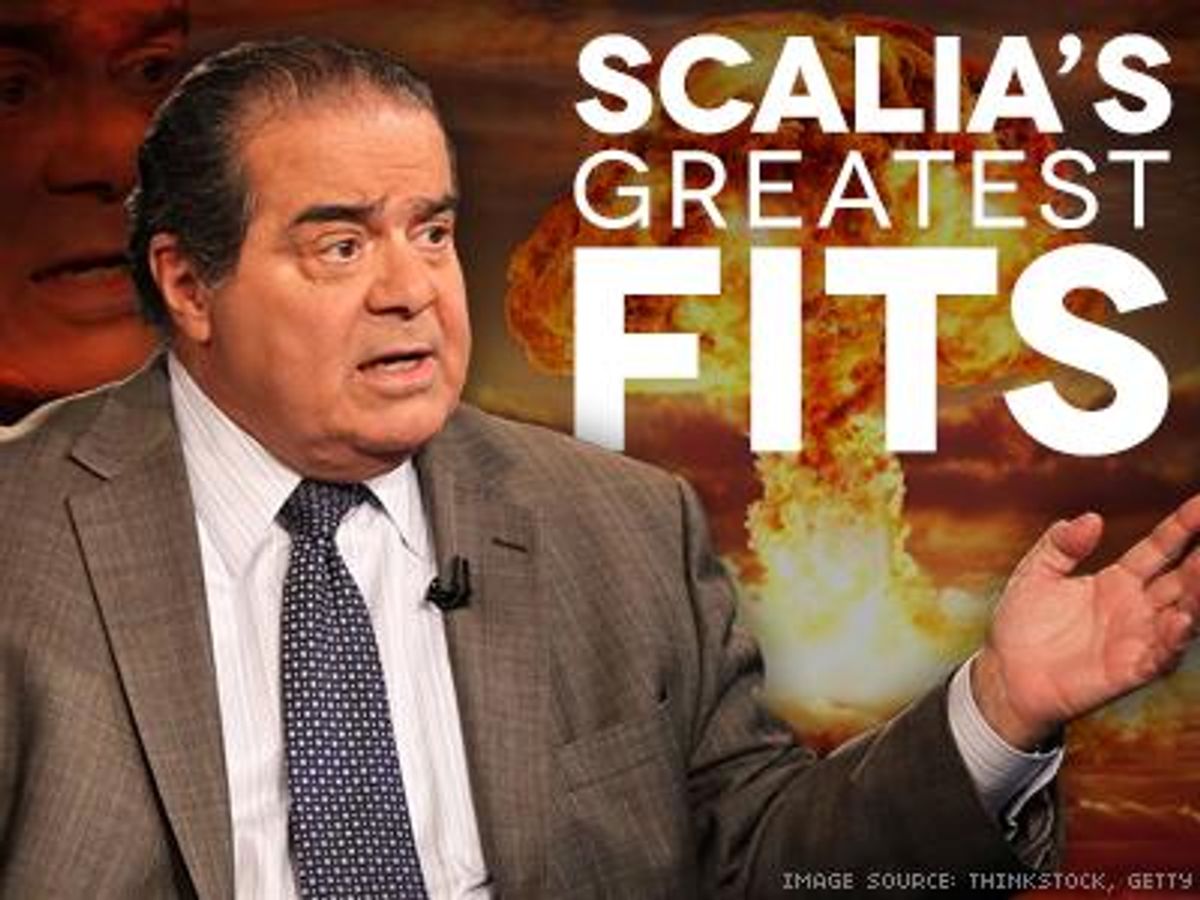 We've collected some of Scalia's greatest fits from four LGBT-related cases. We'd like to bring you some "applesauce" and "jiggery-pokery" too, but those were in his Obamacare dissent. And you'll notice the Proposition 8 case is missing from these fits, but that's because Scalia actually sided with the majority in that decision -- but it involved whether the supporters of the anti-marriage equality measure had standing to defend it in court, not the merits of the measure itself.