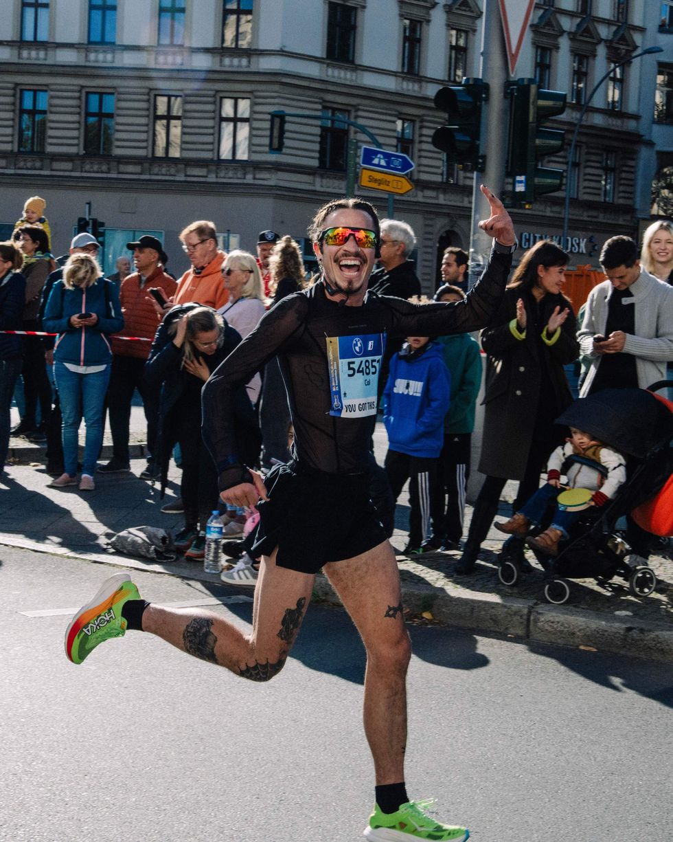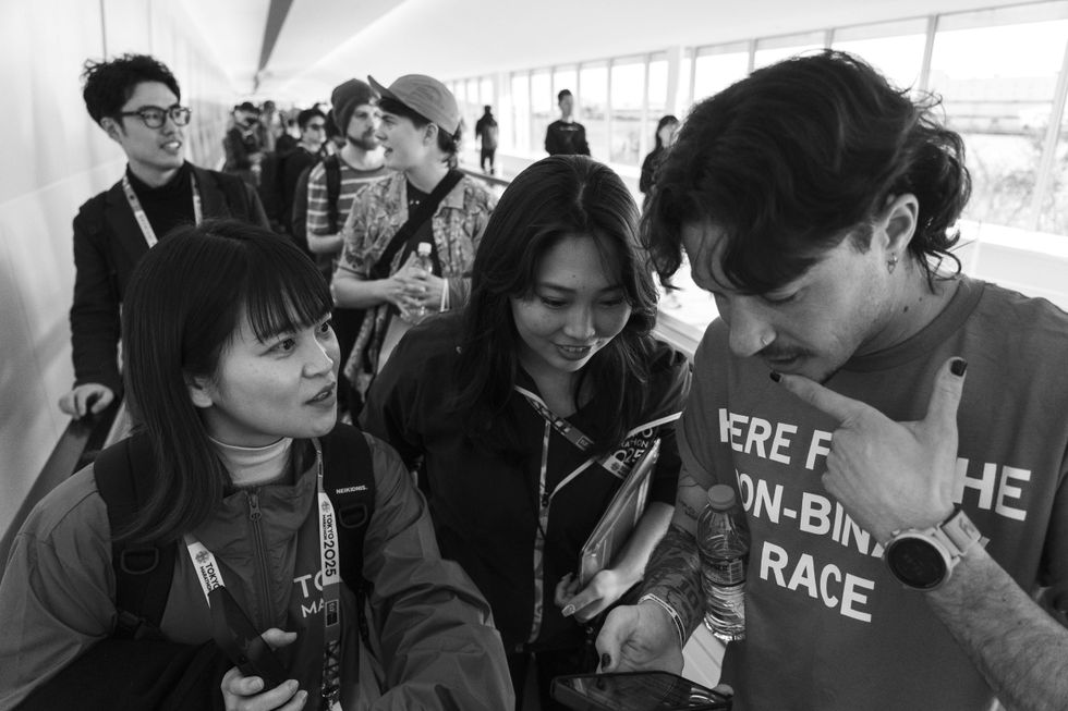 And what a gift these races were. Running through Boston knowing that I played an integral role in a profound moment in history, defined by the world's oldest annual marathon, legitimizing the existence and competition of non-binary athletes. 2:51, second place; the streets of Chicago were lined with people from my life before and after my transition. 2:48, second place; just past the Queensboro Bridge in New York City, a cyclist speaking into his headset, "Cal Calamia from San Francisco." 2:48 again, first place; the cool composure of Berlin, where I kept thinking Running is global. 2:41, second place; hardly sleeping in a room full of trans friends before Tokyo race day, then turning the corner to the vibrant downtown before heading back to that same room to eat onigiri in bed. 2:43, first place; showing up in a trans-flag-inspired custom kit for London, running strong and proud across Tower Bridge. 2:46, first place; becoming the first person ever to podium in all of the World Marathon Majors in a division I instigated felt like my life expanding before my eyes.