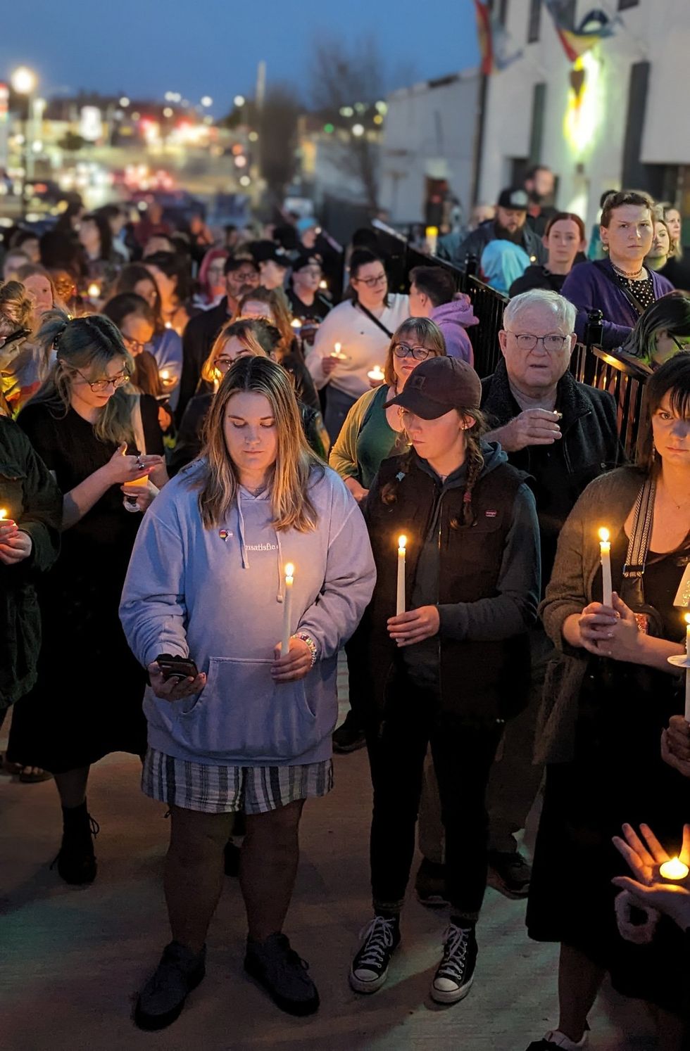I will admit this. Standing just at the street on the outskirts of the crowd, not wanting to intrude on these heartbroken locals, I winced each time a car drove by just behind me. Every passing vehicle produced a tingle up my spine. Events like a memorial for a non-binary kid are magnets for violence. You never know.
