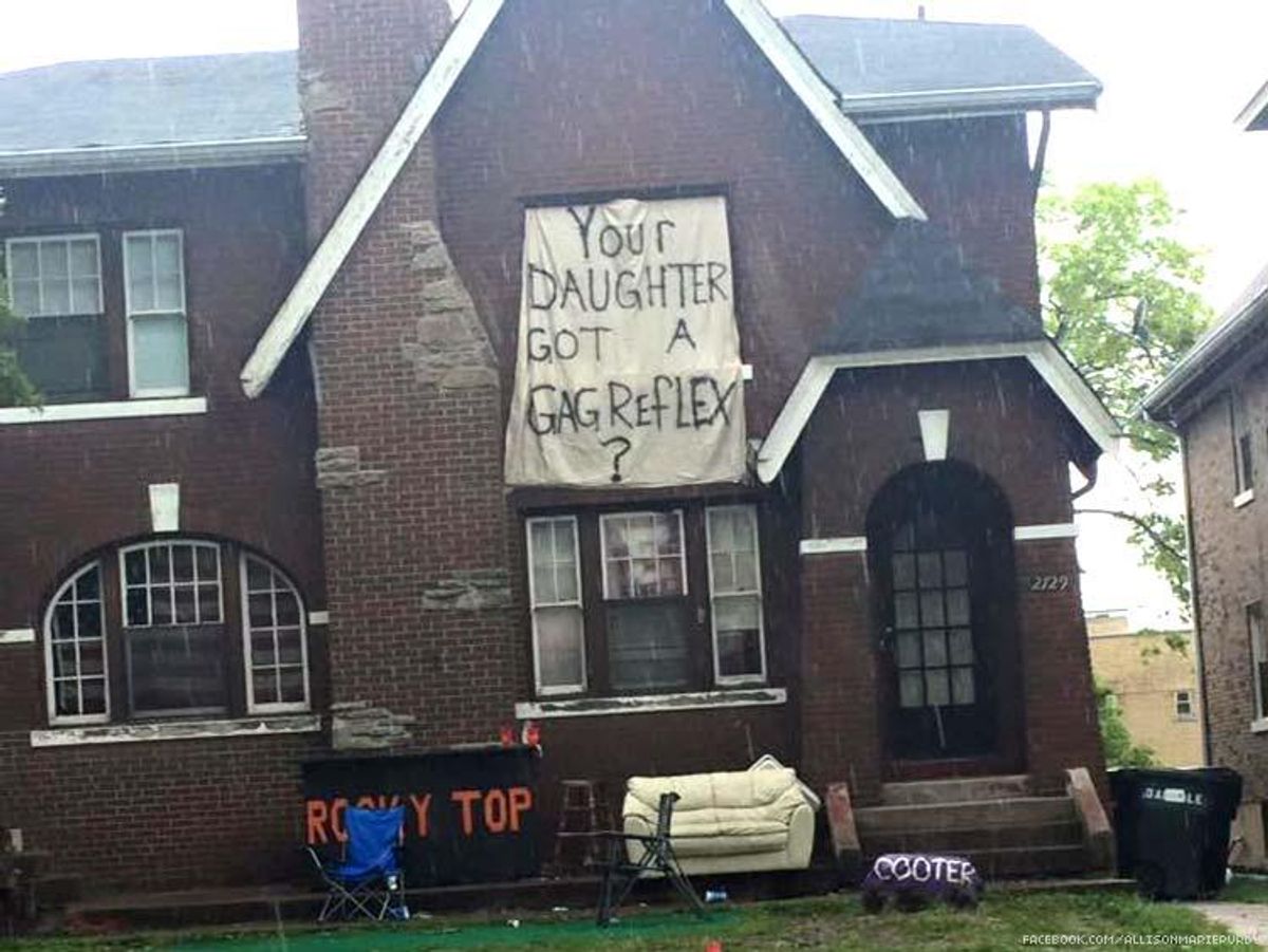 A giant banner sign posted at a home near the University of Cincinnati campus asking "Your daughter got a gag reflex?" has area residents, returning students, and alumni upset, saying it represents rape culture. They're demanding the university take swift action against those responsible.