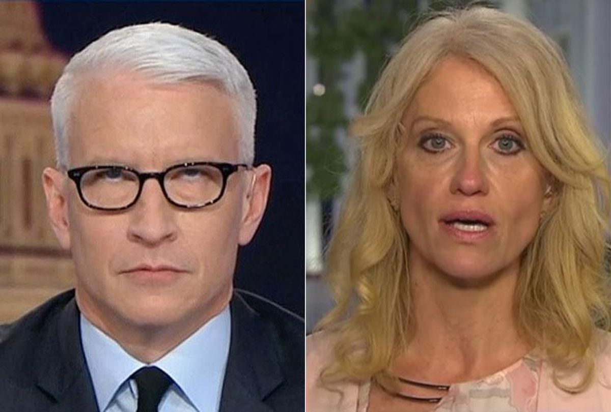 Appearing on Cooper's CNN show on Tuesday, Conway was working hard to defend President Trump's decision to fire the man leading the investigation into his campaign's contacts with Russia, FBI director Jim Comey. Cooper was trying to square the fact that Trump always defended Comey's actions regarding Hillary Clinton -- specifically when the FBI director announced days before the election that the bureau was once again looking at Clinton's email issue -- but then used that as partial rationale for firing him. Cooper played various clips of Trump defending Comey's controversial action, which many say cost Clinton the Electoral College and the election (she walloped Trump in the popular vote).