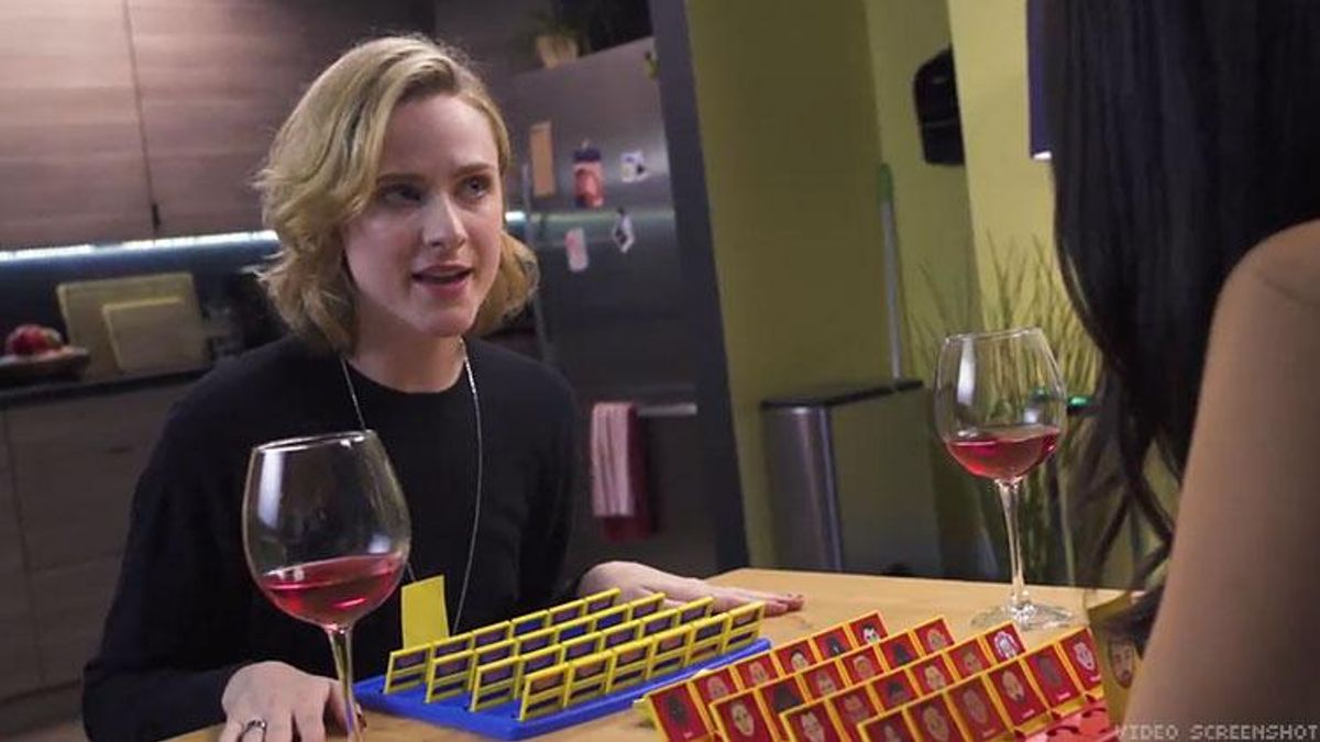 The video features the two actresses face-to-face with their Guess Who? boards loaded with cards depicting the faces of men accused of sexual harassment and/or abuse like Harvey Weinstein, Kevin Spacey, Mario Batali, Matt Lauer, and so on...